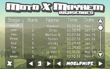 ¡Usa tecnología de acelerómetro para equilibrar tu moto cuando escalas y volar con enormes saltos! Disfruta de la física realista como sus amortiguadores de retroceso cuando te pones en tierra o tu piloto rebota a tu alrededor cuando tienes un accidente. Compite para ser el piloto de motocross más rápido con la tabla de puntuaciones online de Moto X Mayhem.